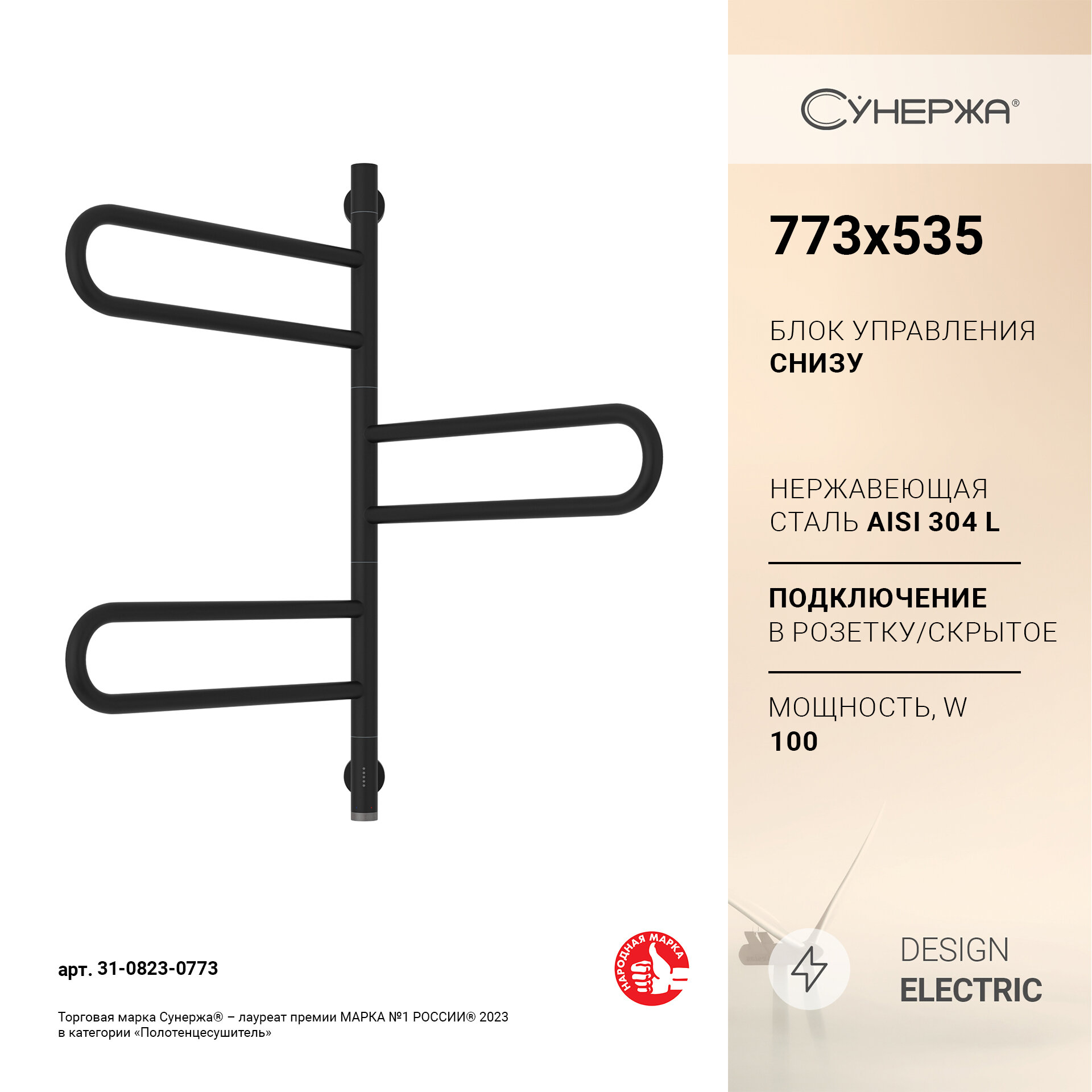 Полотенцесушитель электрический Сунержа Парео 4.0-3С 773х535 31-0823-0773 матовый черный
