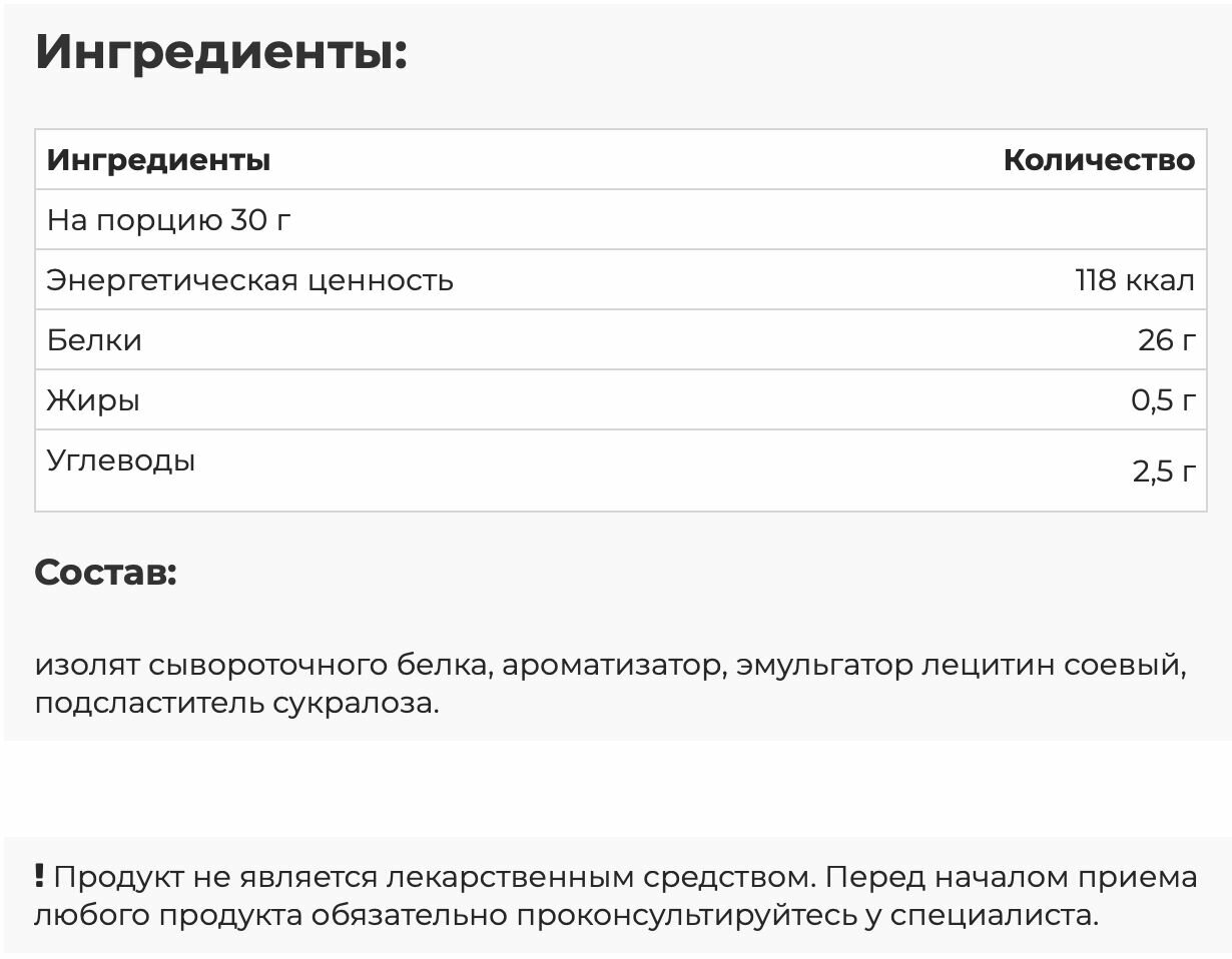| Дополнительная информация | рекомендации по применению: Смешайте две мерные ложки (30 г) с 200-250 мл воды, обезжиренного молока или другого напитка (в зависимости от вкусовых предпочтений). Рекомендуется принимать до 3-х порций в сутки, в зависимости от рациона питания и потребности организма в белке. Можно использовать как ингредиент диетических блюд, в том числе десертов.; состав: изолят сывороточного белка, ароматизатор, эмульгатор лецитин соевый, подсластитель сукралоза |