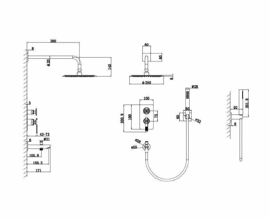 6630CG Душевой комплект встраиваемый 1760's (верхний душ 250, ручной душ, излив) матовое золото