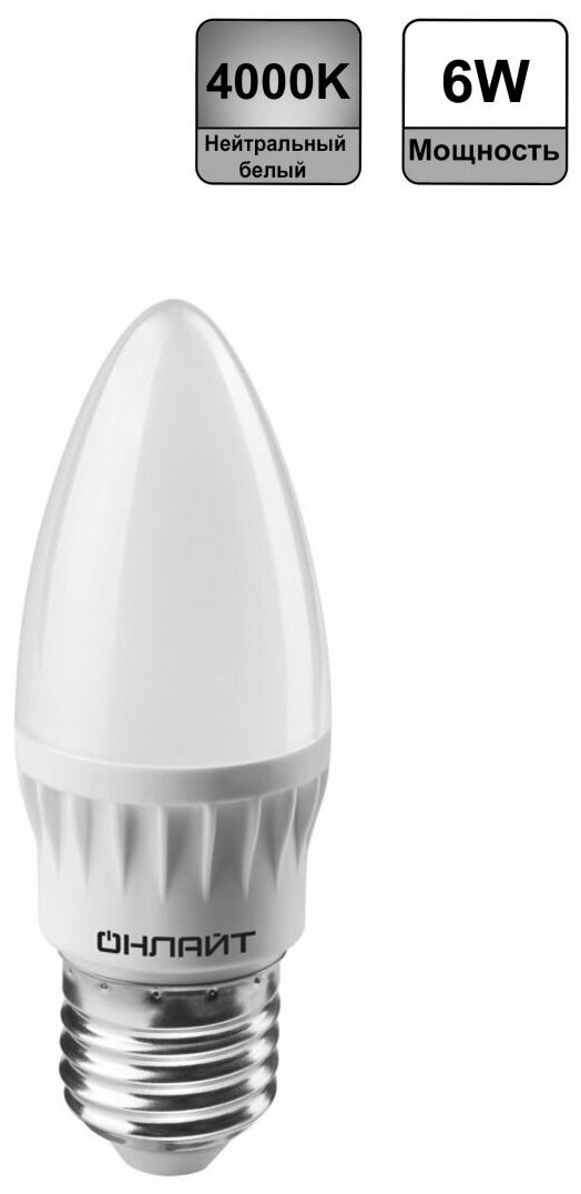 Лампа светодиодная E27, 6 Вт, 60 Вт, свеча, 4000 К, свет холодный белый, Онлайт