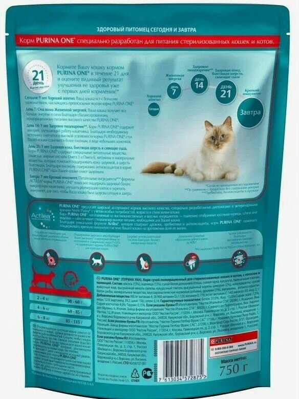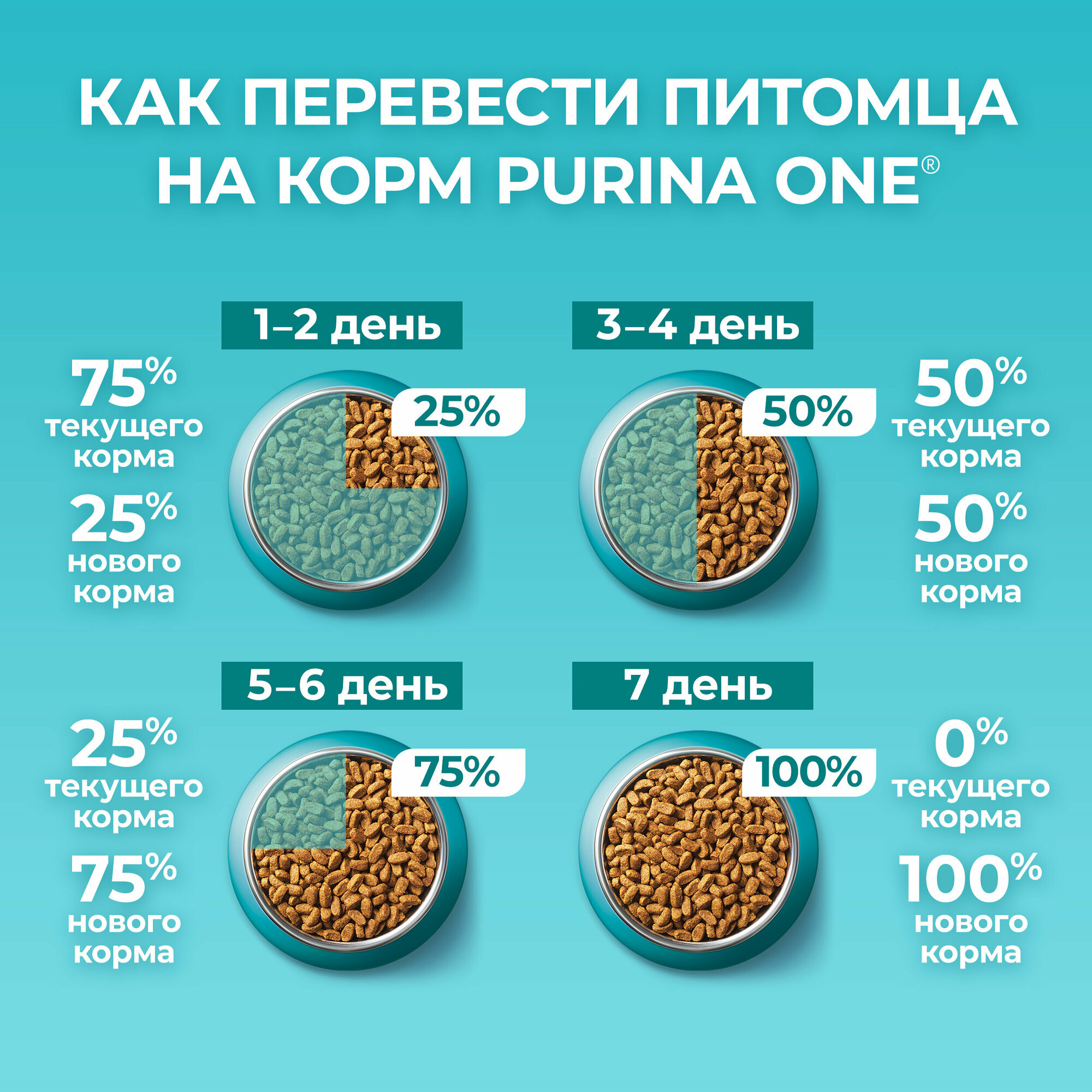 | Дополнительная информация | Если Вы предлагаете Вашей кошке корм Purina ONE впервые, рекомендуем переводить на новый корм постепенно. В течение 7 дней уменьшайте исходный рацион, увеличивая дозу корма Purina ONE. Это позволит пищеварительной системе Вашей кошки лучше адаптироваться к изменению корма. |