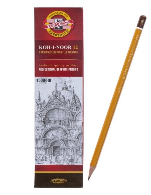 Карандаш чернографитный KOH-I-NOOR 1500, 1 шт., HB, корпус желтый, заточенный, 15000HB01170RU Комплект - 12 шт.