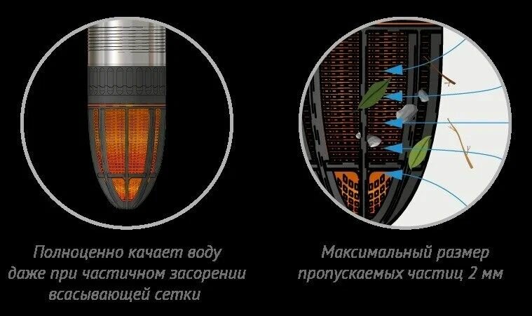 | Плюсы: | Хорошие насосы, забор снизу - помогает от заиливания скважины. |