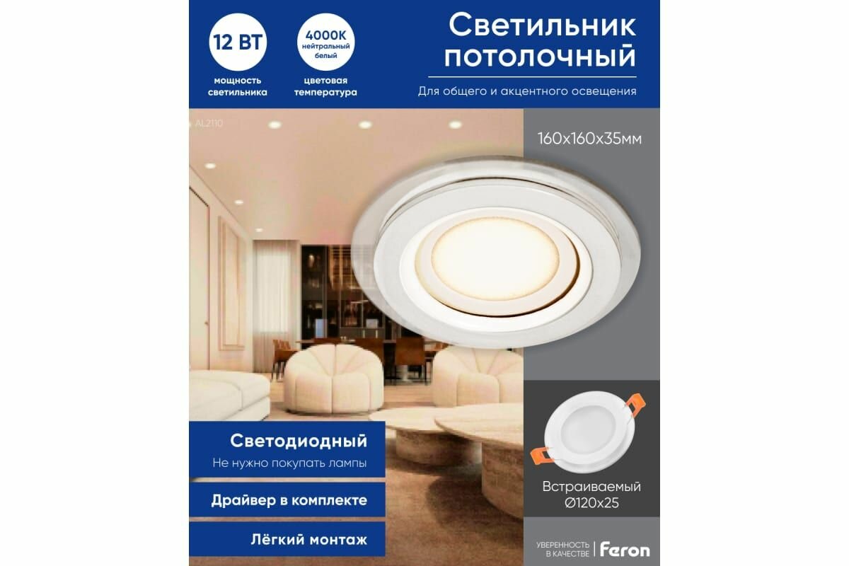 Светильник Feron Светильник встраиваемый светодиодный FERON AL2110, 27851, 12W 4000K 960Lm IP20, LED, 12 Вт, 4000, нейтральный белый, цвет арматуры: белый, цвет плафона: бесцветный