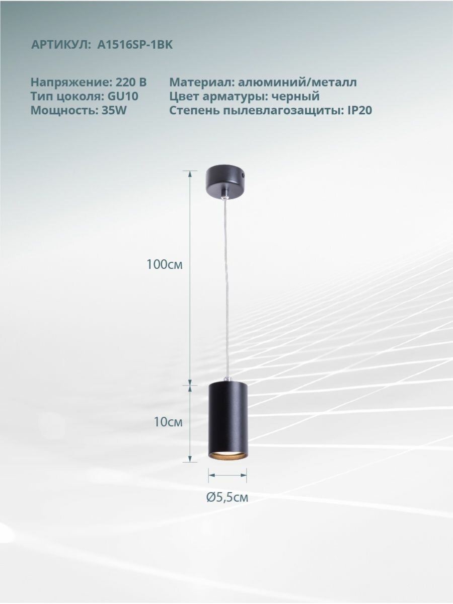 Светильник подвесной Arte Lamp Canopus A1516SP-1BK, GU10, кол-во ламп:1шт., Черный