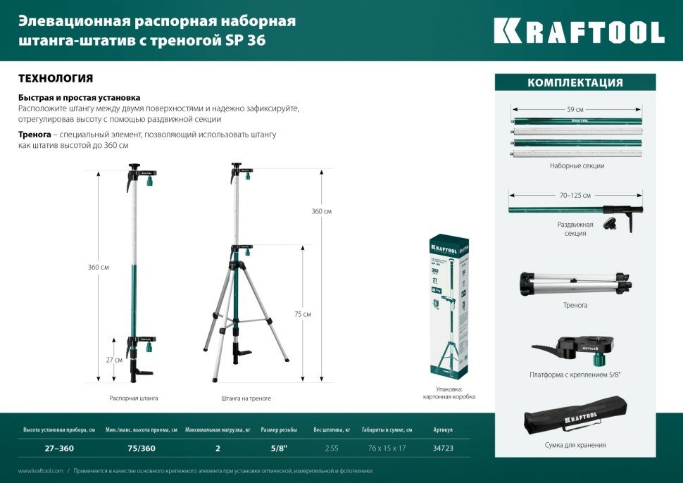 KRAFTOOL SP 36, Элевационная распорная наборная штанга-штатив с треногой (34723)