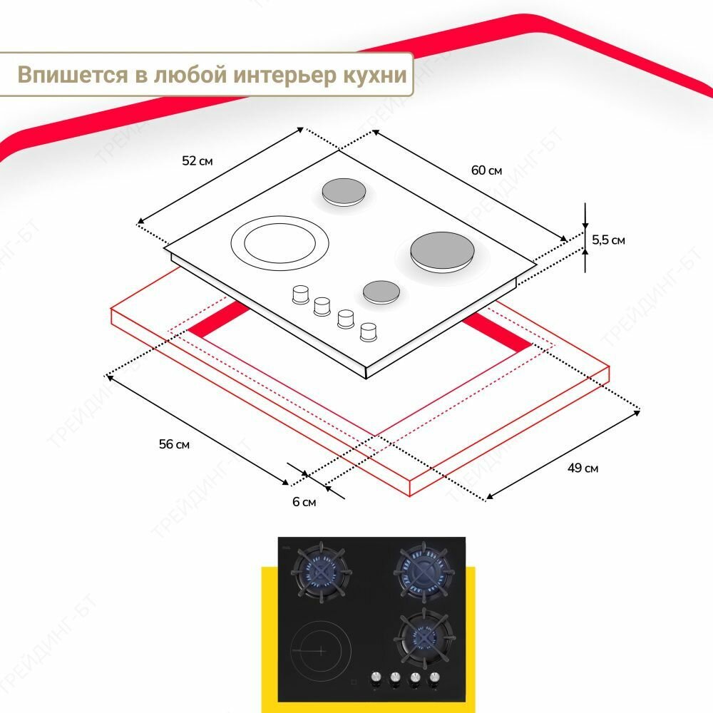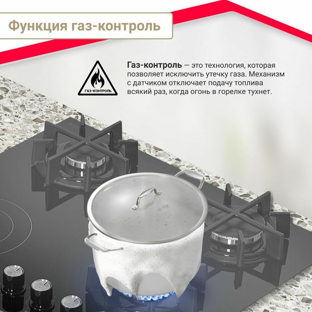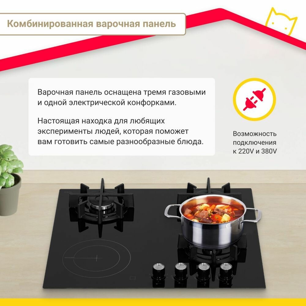 Комбинированная варочная панель Simfer H60N32S522, черное стекло, три газовые и одна электрическая конфорка, 2-х контурная зона нагрева, чугунные решетки, автоподжиг интересное: