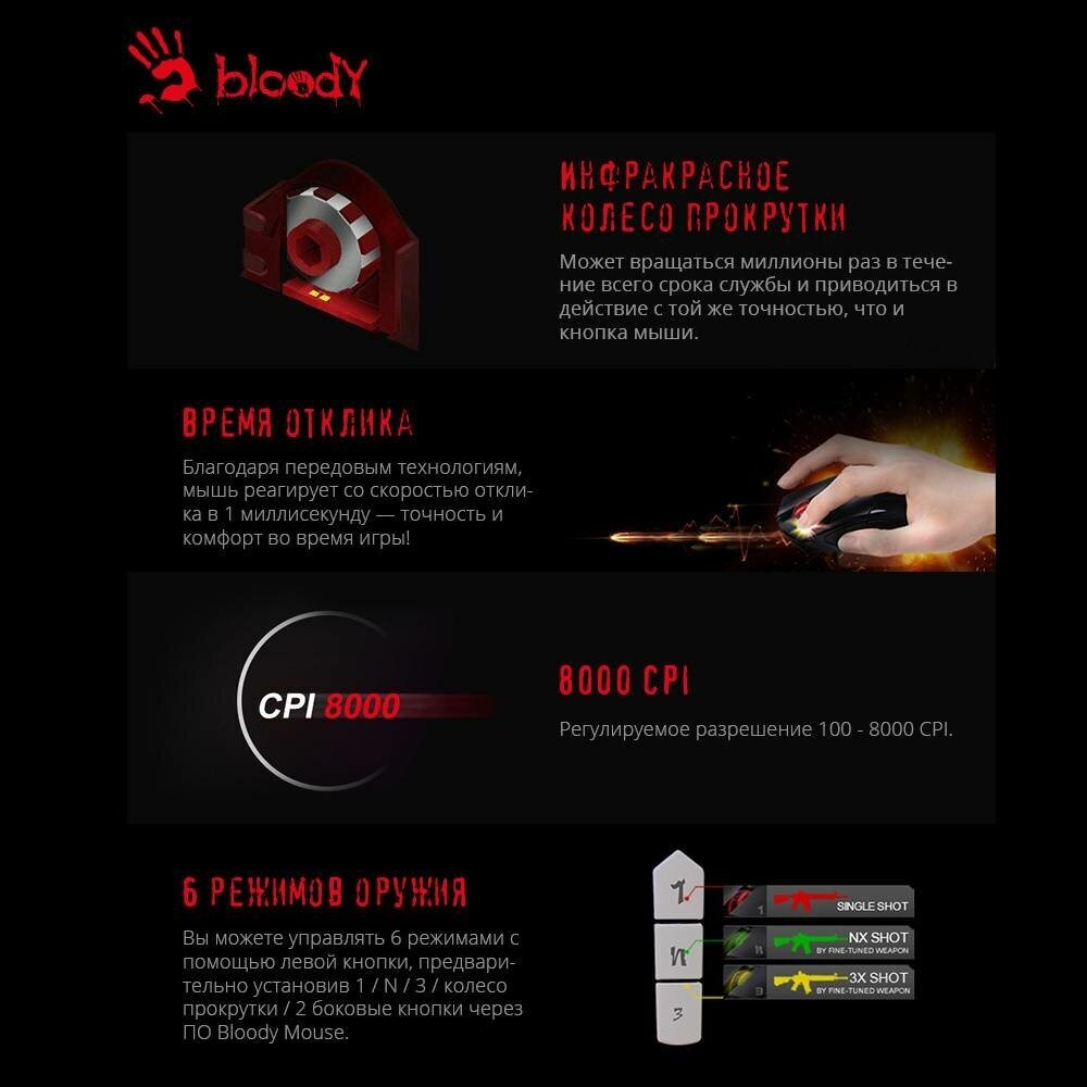 | Отзыв: | Пользуюсь мышью 1,5 года, все супер, никаких технических проблем нет, ни разу не было даблклика и прочего. Очень нравится быстрый отклик и точное позиционирование. До неё у меня была Logitech g102 и Bloody мне нравится гораздо больше в этом плане и не только.