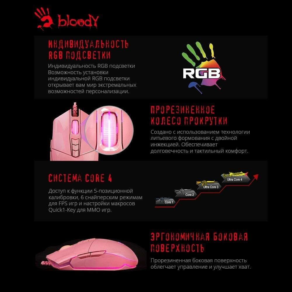 Ниже Вы можете прочитать отзывы на Мышь A4Tech Bloody P91s розовый оптическая 8000dpi USB 8but, ознакомится с подробными характеристиками, посмотреть интересные обзоры и фотографии на Мышь A4Tech Bloody P91s розовый оптическая 8000dpi USB 8but.