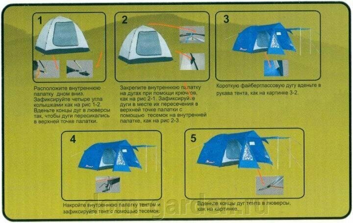 | Минусы: | В коробке написано палатка на 3 человека. Хотели уже возвращать. А открыв на сумке написано для 4 ых. Нет инструкции по сборке. Пришлось по картинке соображать. Цвет не как на картинке. Сине красный. |