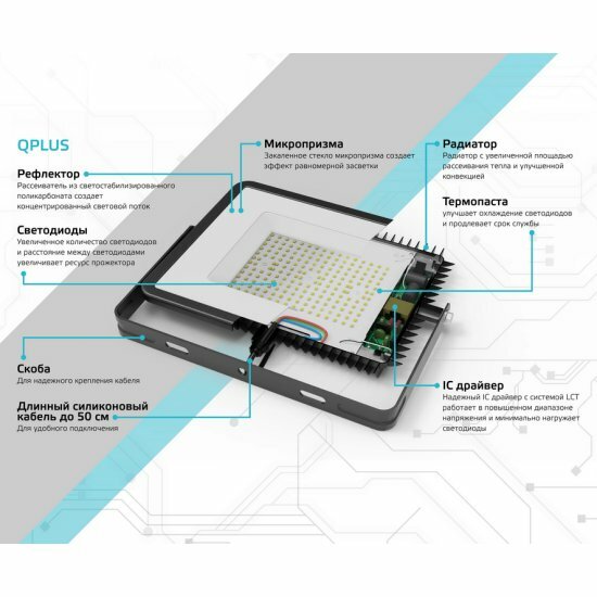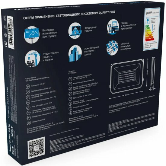Прожектор GAUSS Qplus 50w 6000lm 6500k 175-265v ip65 черный led