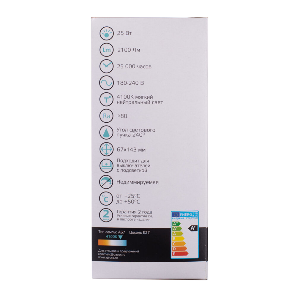 Ниже Вы можете прочитать отзывы на Лампа светодиодная Gauss E27 4100К 25 Вт 2100 Лм 180-240 В груша A67/A70 матовая, ознакомится с подробными характеристиками, посмотреть интересные обзоры и фотографии на Лампа светодиодная Gauss E27 4100К 25 Вт 2100 Лм 180-240 В груша A67/A70 матовая.