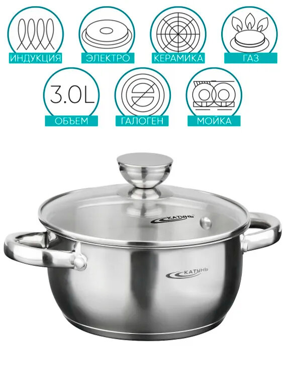 Катунь Антея КТ05-D-18, Кастрюля 2,0л (из нержавеющей стали, стеклянная крышка)
