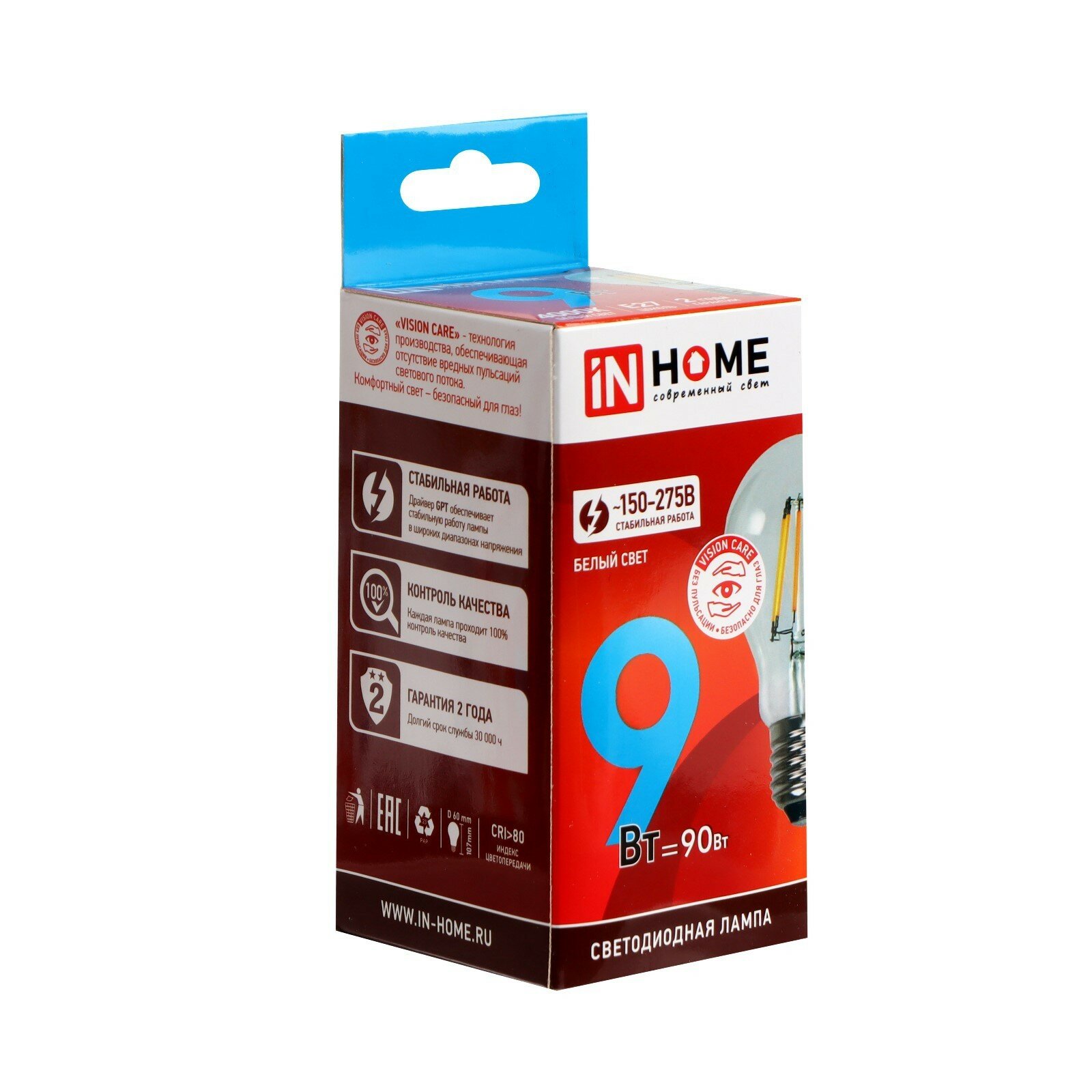 Лампа светодиодная IN HOME LED-A60-deco, 9 Вт, 230 В, Е27, 6500 К, 810 Лм, прозрачная, "INhome"