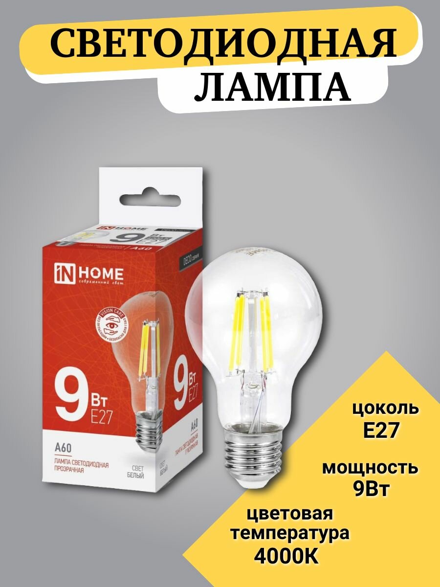 Лампа светодиодная IN HOME LED-A60-deco, 9 Вт, 230 В, Е27, 4000 К, 1040 Лм, прозрачная