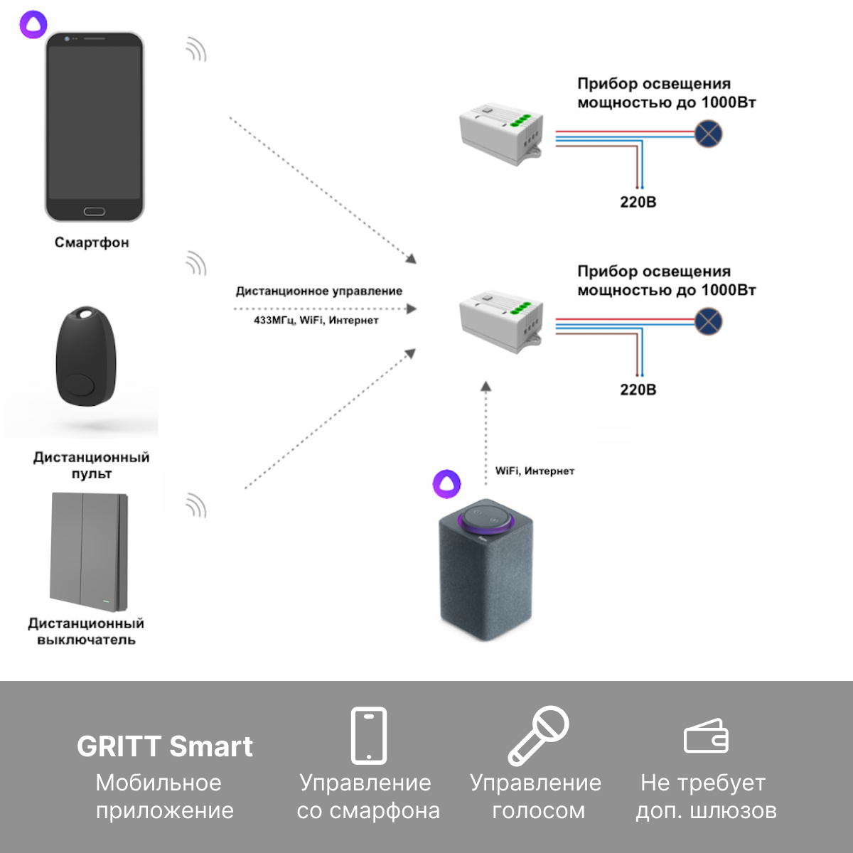 Умный беспроводной выключатель GRITT Evolution 2кл. белый комплект: 1 выкл. IP67, 2 реле 1000Вт 433 + WiFi с управлением со смартфона