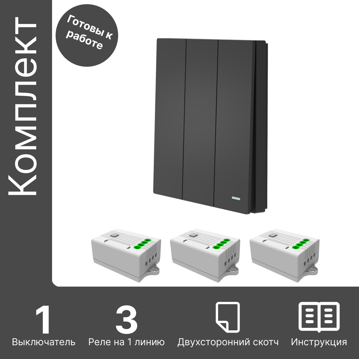 Умный беспроводной выключатель GRITT Evolution 3кл. графит комплект: 1 выкл. IP67, 3 реле 1000Вт 433 + WiFi с управлением со смартфона, EV221330GRWF