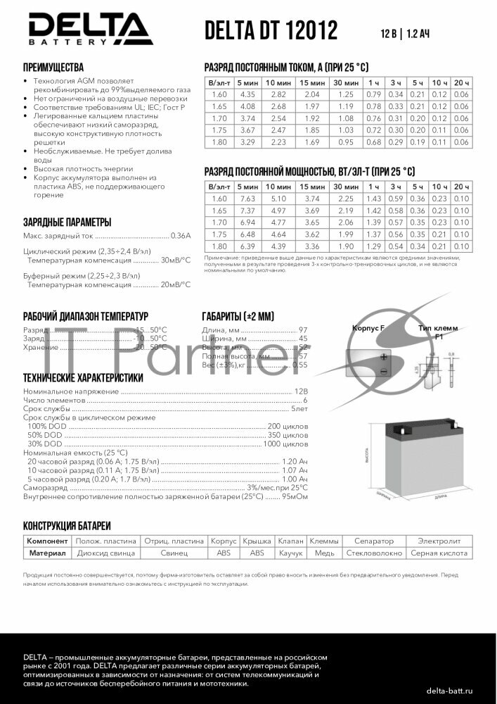 Ниже Вы можете прочитать отзывы на Батарея DELTA серия DT, DT 12012, напряжение 12В, емкость 1.2Ач (разряд 20 часов), макс. ток разряда (5 сек.) 19.5А, макс. ток заряда 0.36А, свинцово-кислотная типа AGM, клеммы F1, ДxШxВ 97х45х52мм., вес 0.55кг., срок службы 5 лет. Delta DT 12012 (12V /, ознакомится с подробными характеристиками, посмотреть интересные обзоры и фотографии на Батарея DELTA серия DT, DT 12012, напряжение 12В, емкость 1.2Ач (разряд 20 часов), макс. ток разряда (5 сек.) 19.5А, макс. ток заряда 0.36А, свинцово-кислотная типа AGM, клеммы F1, ДxШxВ 97х45х52мм., вес 0.55кг., срок службы 5 лет. Delta DT 12012 (12V /.
