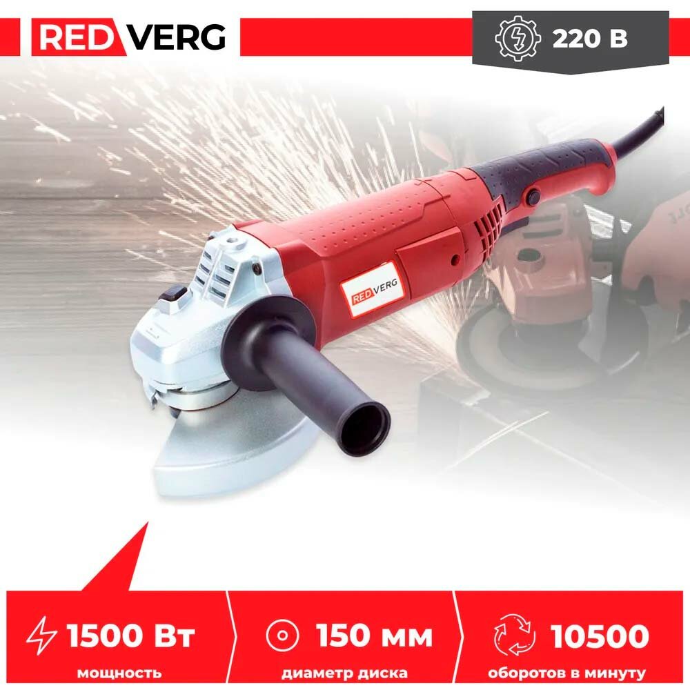 Угловая шлифмашина Redverg RD-AG150-150S, мощность мотора 1500 ВТ, щеточная (RD-AG150-150S)