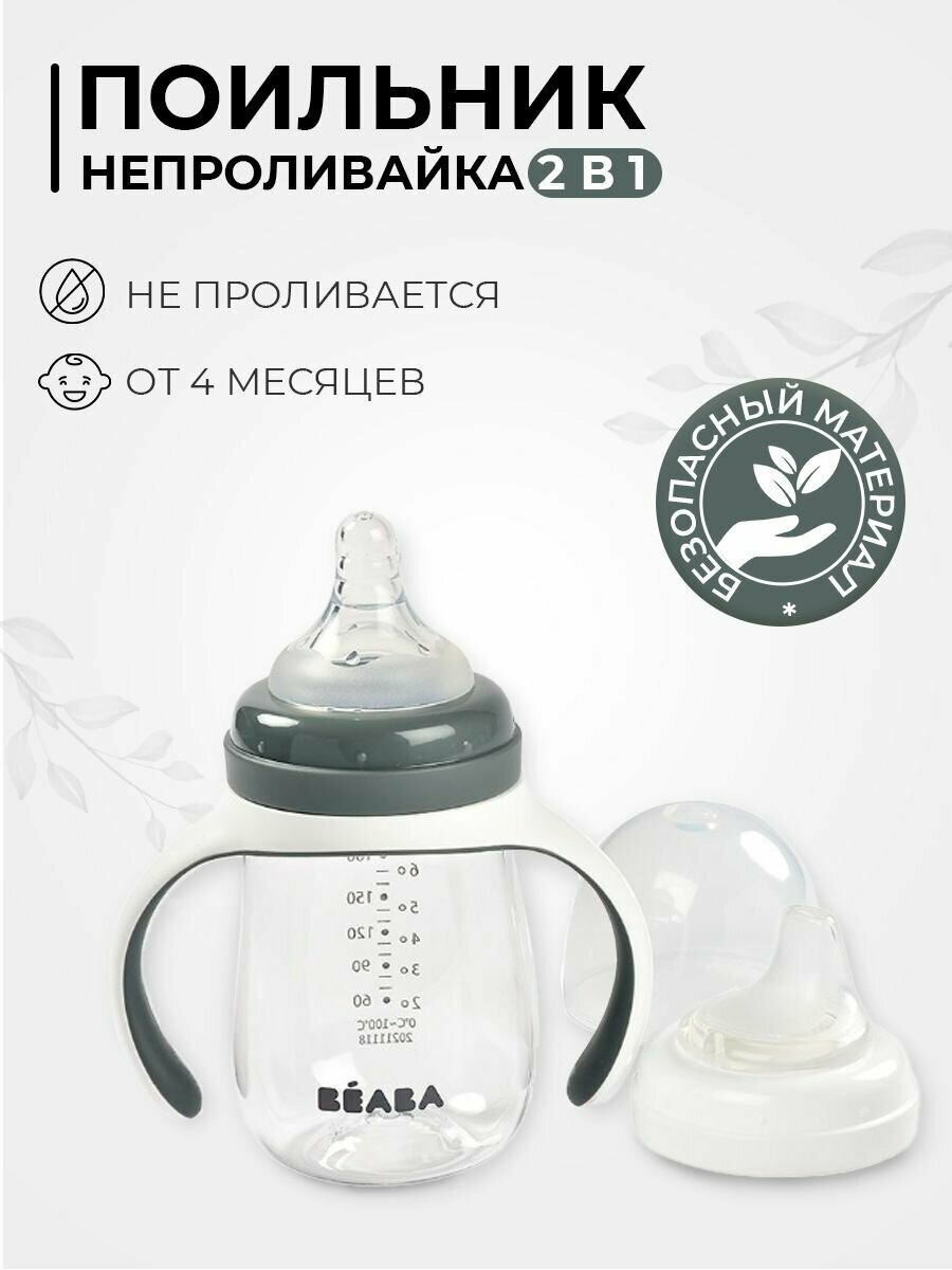 Beaba Поильник 2 в 1 (Серый), 210мл, с 4 месяцев