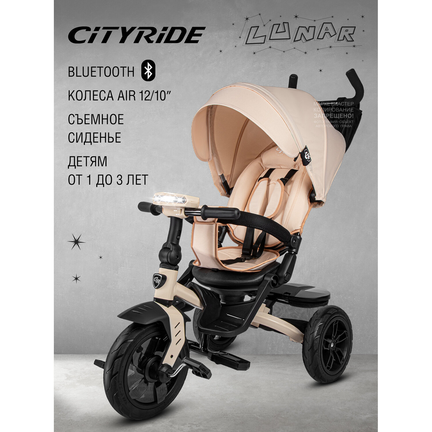 Купить Велосипед детский 3-колесный ТМ CITYRIDE LUNAR, складная крыша, надувные колеса 12"/10", ножной тормоз, поворот сиденья 360◦, свет/звук, CR-B3-10BG1