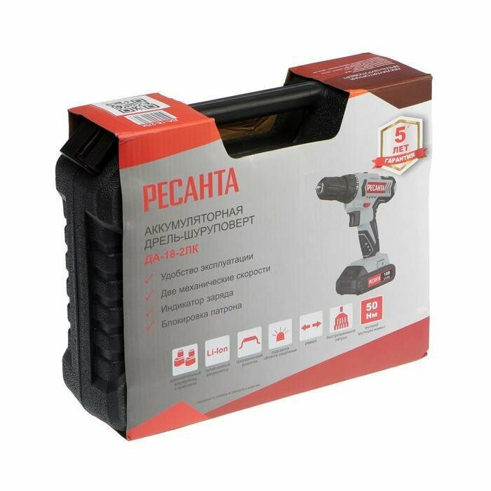 Купить Дрель-шуруповерт 'Ресанта' ДА-18-2ЛК, 18 Вт, 2х2 Ач, Li-Ion, 50 Нм, 400/1400 об/мин подарок