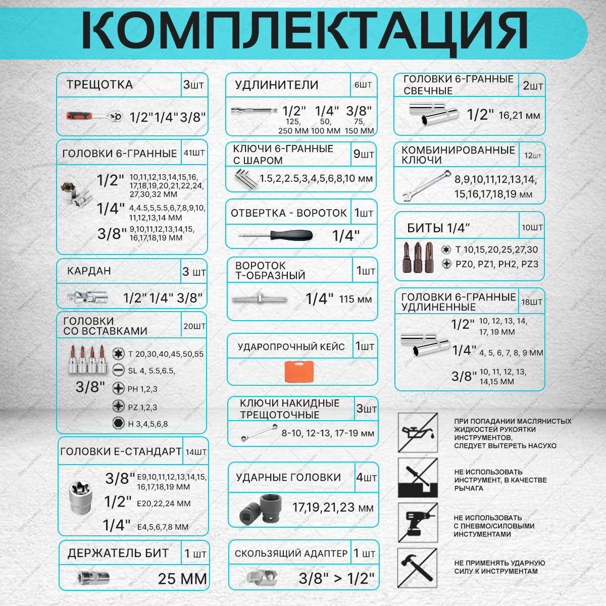 | Головки торцевые подробно | 6 шт. — 1/2" Удлиненные головки: 10、12、13、14、17、19 мм 6 шт. — 3/8" Удлиненные головки: 10、11、12、13、14、15 мм 2 шт. — 3/8" Головки свечные 16、21 мм 6 шт. — 1/4" Удлиненные головки: 4、5、6、7、8、9 мм 17 шт. — 1/2" Торцевая головка: 10、11、12、13、14、15、16、17、18、19、20、21、22、24、27、30、32 мм 11 шт. — 3/8" Торцевая головка: 9、10、11、12、13、14、15、16、17、18、19 мм 13 шт. — 1/4" Торцевая головка: 4、4.5、5、5.5、6、7、8、9、10、11、12、13、14、мм 1 шт. — 1/4" Торцевая головка 20 шт. — 3/8" Головки торцевые со вставкой ( плоские: 4、5.5、6.5;крестообразные PZ1 PZ2 PZ3;крестовые 1 2 3;шестигранники: 3、4、5、6、8、10;TORX T30、T40、T45、T50、T55 ) 14 шт. — Головки Е-профиль: 4、5、6、7、8、10、11、12、14、16、18、20、22、44 мм 4 шт. — Ударные головки: 17、19、21、23 мм |