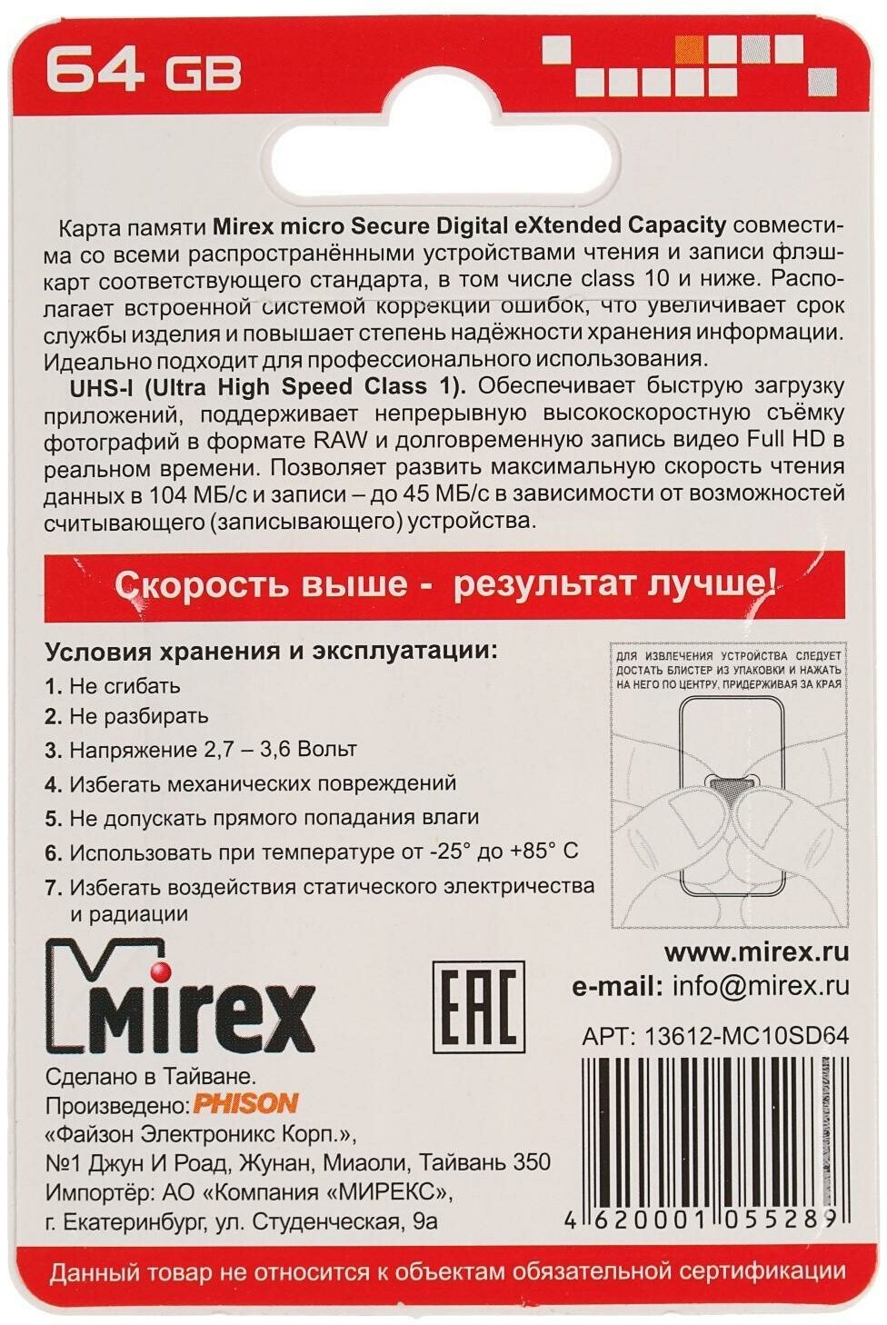 Карта памяти Mirex microSD, 64 Гб, Sdxc, Uhs-i, класс 10 4245644 Mirex . интересное:
