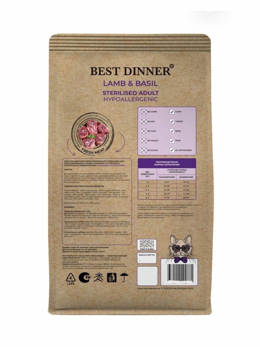Best Dinner Сухой корм для стерилизованных кошек Ягненок с Базиликом 78102, 1,5 кг