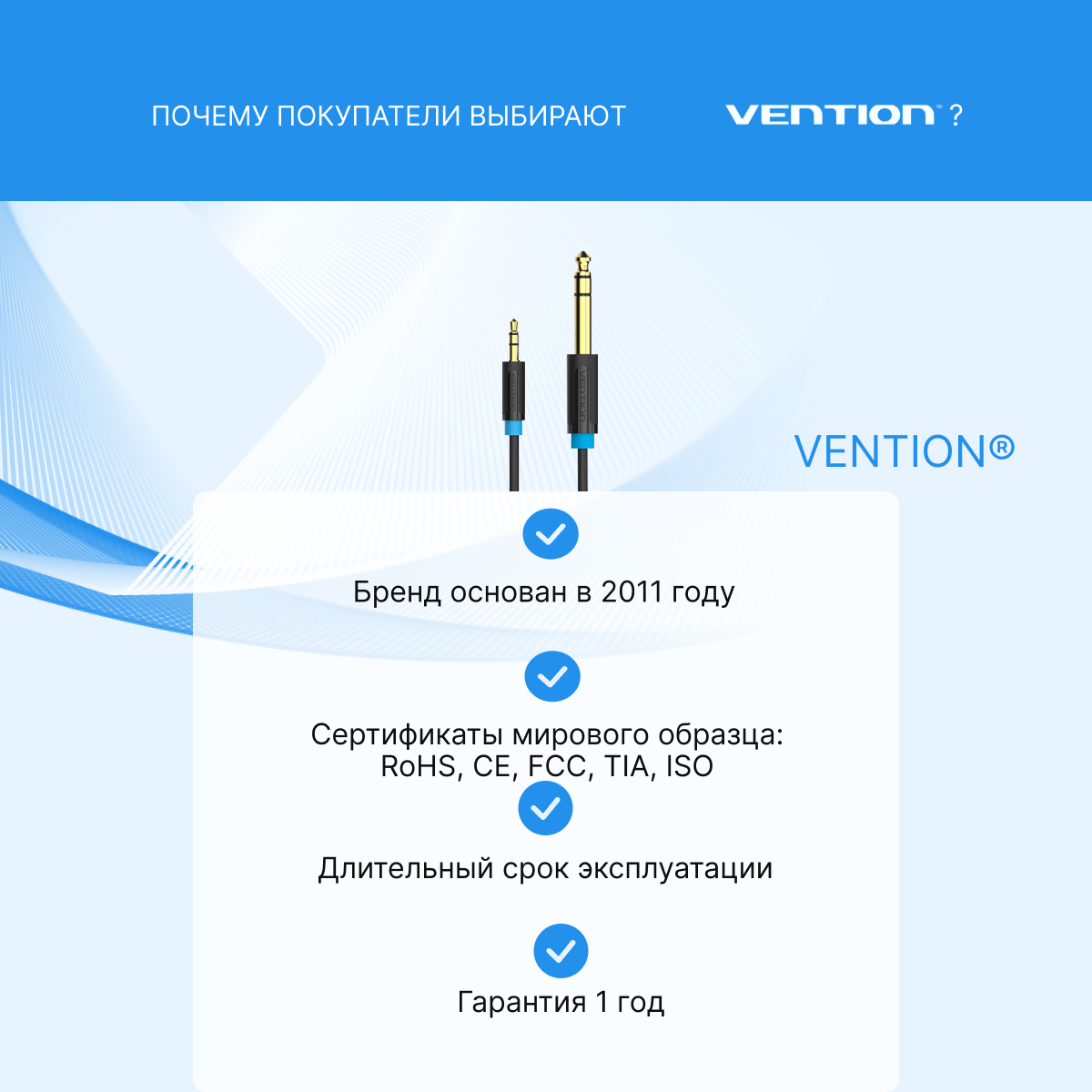 Aux кабель Jack-Jack 6.35 (папа) Моно 2 метра Vention переходник для подключения гарнитуры и акустических систем к ПК, смартфону, машине, арт. BAABH