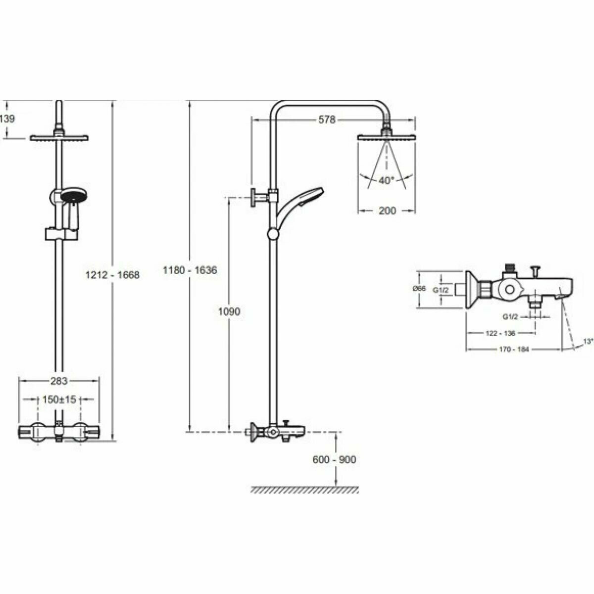 | Дополнительная информация | высота стойки для душа: 1668 мм; диаметр душевой лейки: 90 мм; размеры верхнего душа: 200х200 мм; с ограничением температуры воды |