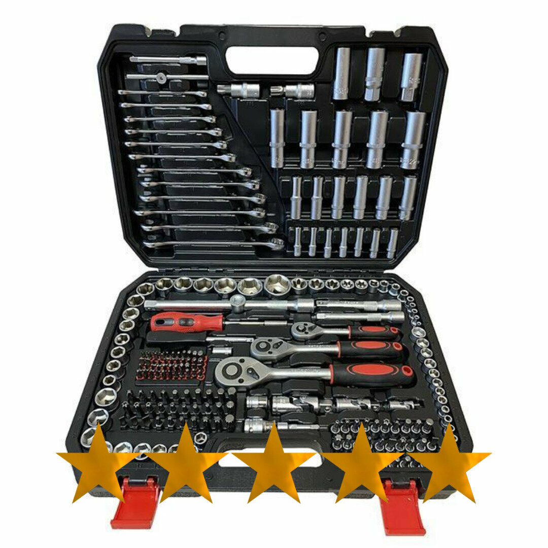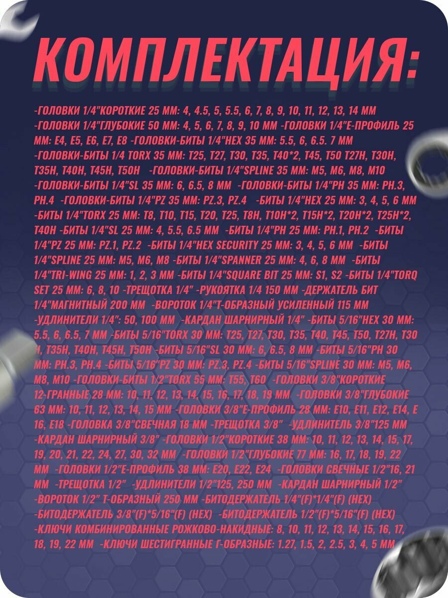 | Головки торцевые подробно | 1/2: шестигранные 38 мм: 10, 11, 12, 13, 14, 15, 17, 19, 20, 21, 22, 24, 27, 30, 32 мм; E20, E22, E24 мм; свечные: 16, 21 мм; глубокие 77 мм: 16, 17, 18, 19, 22 мм; удлинители 125 мм и 250 мм, трещотка, кардан, вороток; 3/8: шестигранные 28 мм: 10, 11, 12, 13, 14, 15, 16, 17, 18, 19 мм; E10, E11, E12, E14, E16, E18 мм; свечная 18 мм; удлинитель 125 мм, трещотка, кардан; 1/4: шестигранная 25 мм: 4, 4.5, 5, 5.5, 6, 7, 8, 9, 10, 11, 12, 13, 14 мм; E4, E5, E6, E7, E8 мм; глубокие 50 мм: 4, 5, 6, 7, 8, 9, 10 мм; со вставками: HEX 3-4-5-6-7-8 мм; TORX Т8-Т8-Т10-Т10-Т15-Т20-Т25-Т27-Т30-Т40 / SL: 4-5,5-6,5-7-8-8 мм ; PH: РН.1-РН.2-РН.2-РН.3; PZ: PZ.1-PZ.2-PZ.2-PZ.3 трещотка реверсивная. удлинители 50 и 100 мм. кардан шарнирный. вороток Т-образный. отвертка-вороток. |