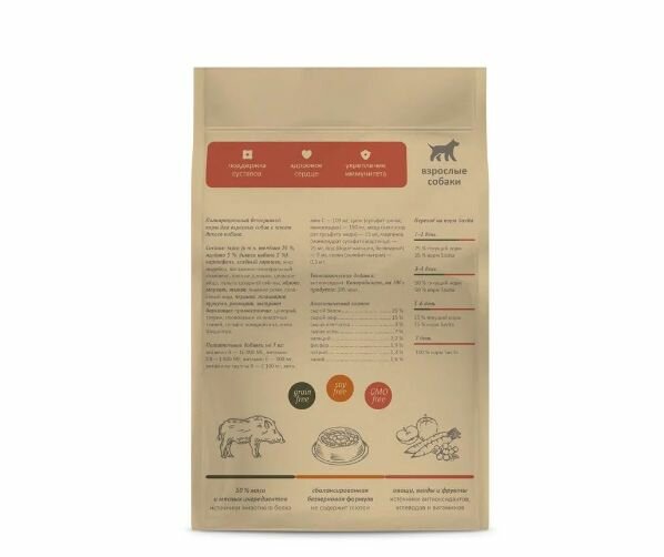 | Состав | мясо (в т.ч. телёнка 25 %, ягнёнка 5 %, дикого кабана 5 %), картофель, зелёный горошек, жир индейки, витаминно-минеральный комплекс, пивные дрожжи, цельное яйцо, пульпа сахарной свёклы, яблоко, морковь, тыква, льняное семя, лососёвый жир, черника, ламинария, куркума, розмарин, экстракт бархатцев прямостоячих, цикорий, таурин, глюкозамин из животных тканей, сульфат хондроитина, юкка Шидигера |