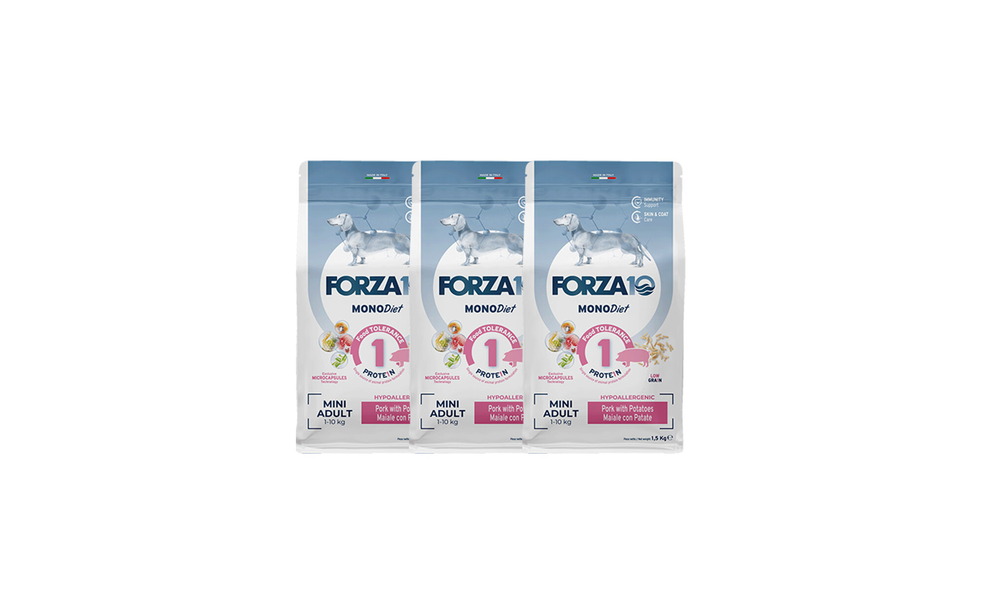 FORZA10 DOG MINI MONODIET LOW GRAIN монобелковый для взрослых собак маленьких пород при аллергии со свининой и картофелем (1,5 кг)