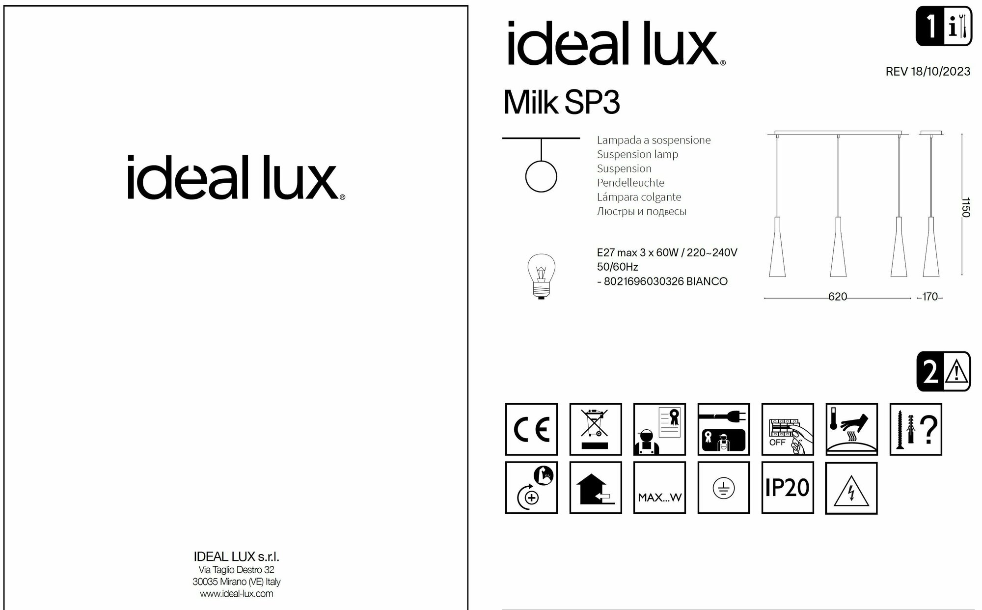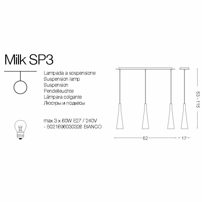Светильник подвесной ideal lux Milk SP3 макс.3х60Вт IP20 e27 230В Белый Стекло/Металл Без ламп 030326. интересное: