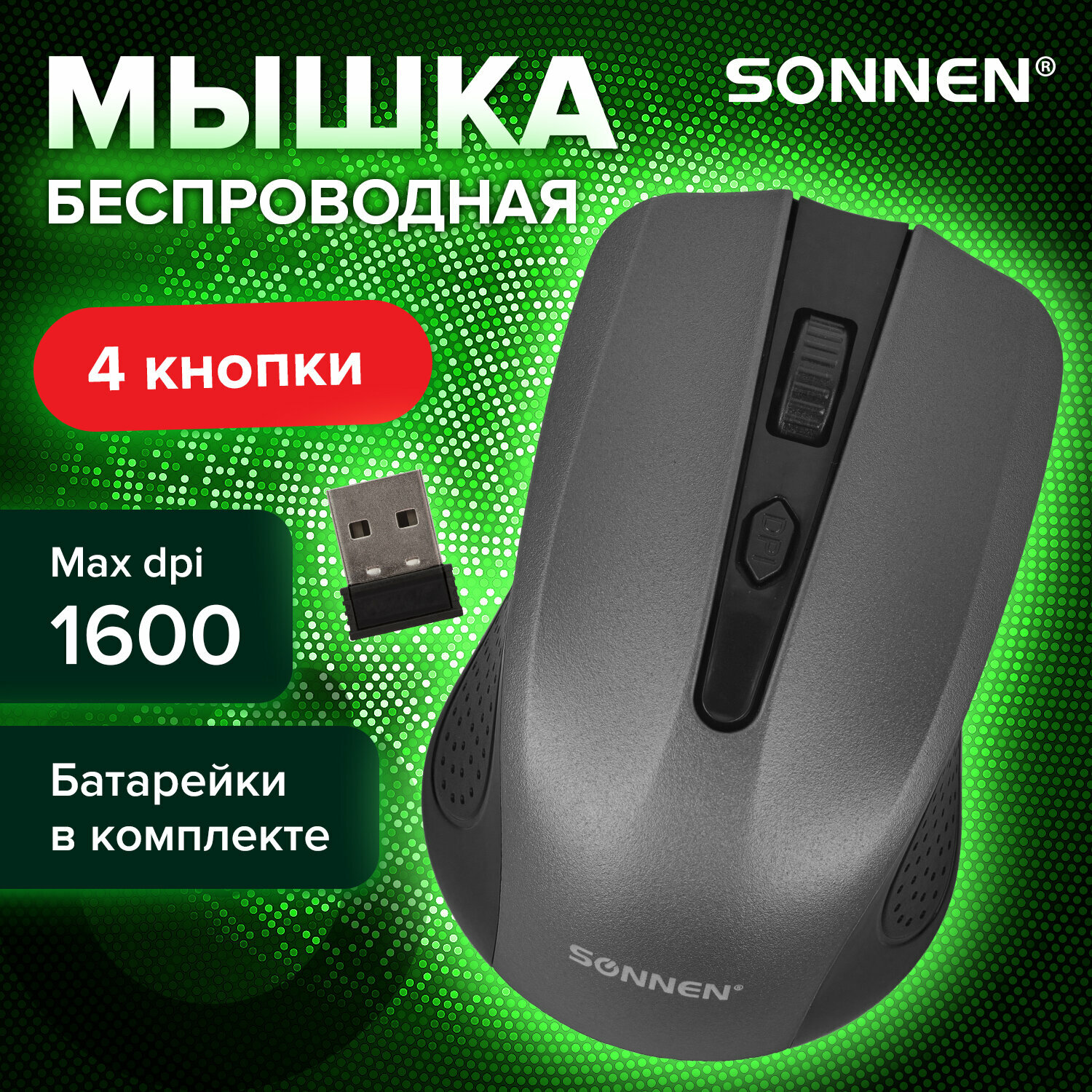 Мышь беспроводная SONNEN V99, USB, 1000/1200/1600 dpi, 4 кнопки, оптическая, серая, 513528 Комплект - 1 шт .