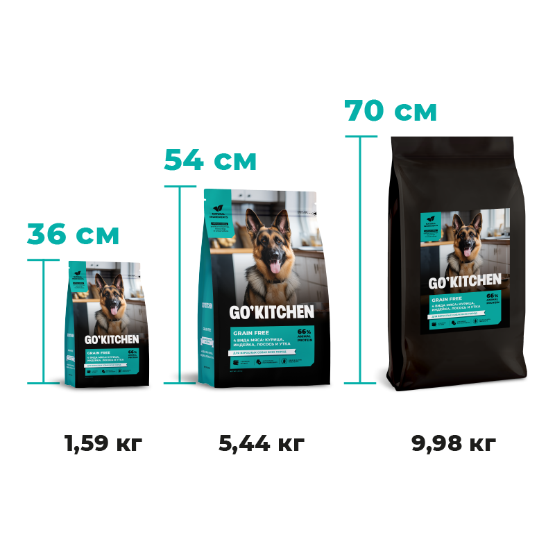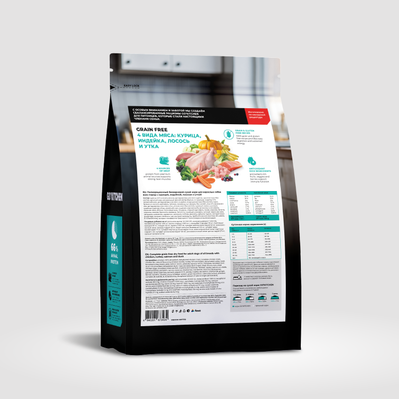 GO'KITCHEN беззерновой корм для взрослых собак всех пород с курицей, индейкой, лососем и уткой, GRAIN FREE ADULT 4 Meat Recipe, 5,44 кг