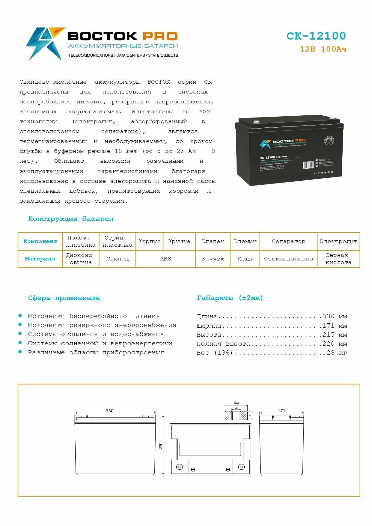 Аккумулятор восток PRO CK-12100 (12В, 100Ач / 12V, 100Ah) (UPS серия) интересное: