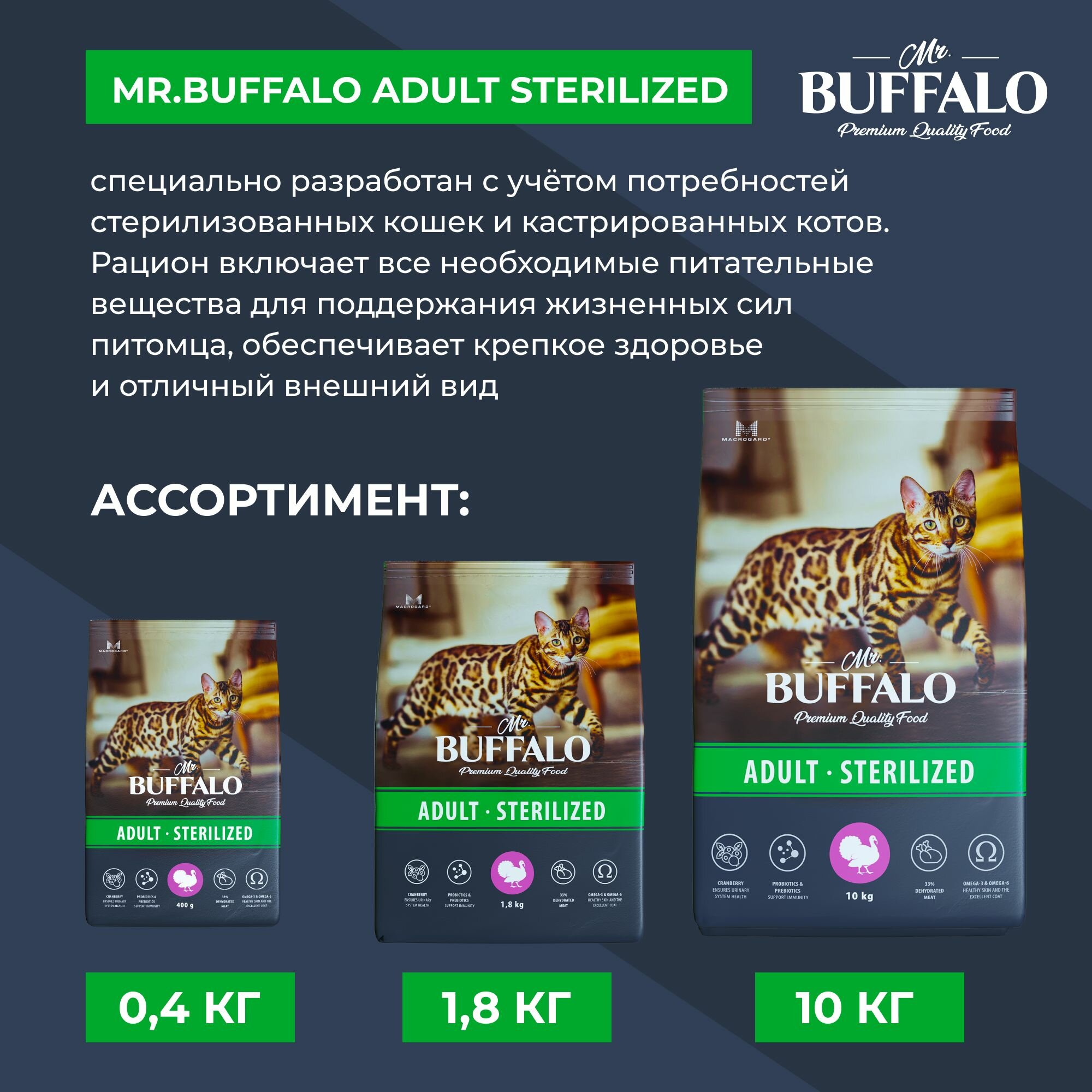 Сухой Корм Mr.Buffalo (Мистер Буффало) Для Стерилизованных Кошек Индейка Adult Sterilized 1,8кг, 1 шт