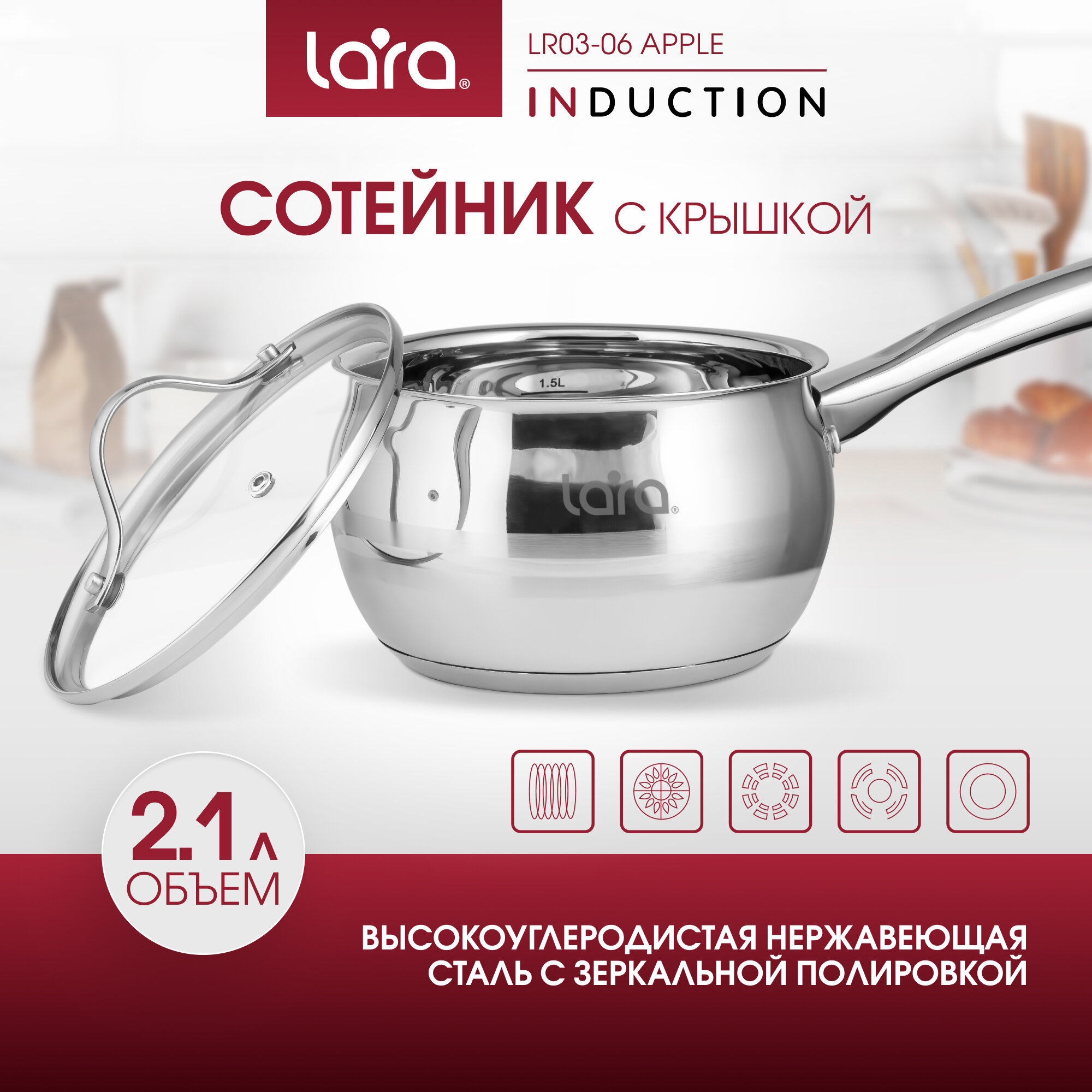 Купить Сотейник с крышкой 2,1 л LARA LR03-06 APPLE / d-16 см/ нержавеющая сталь/ для всех типов плит/ковш