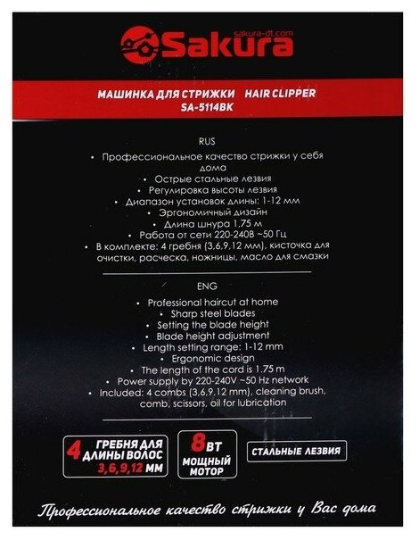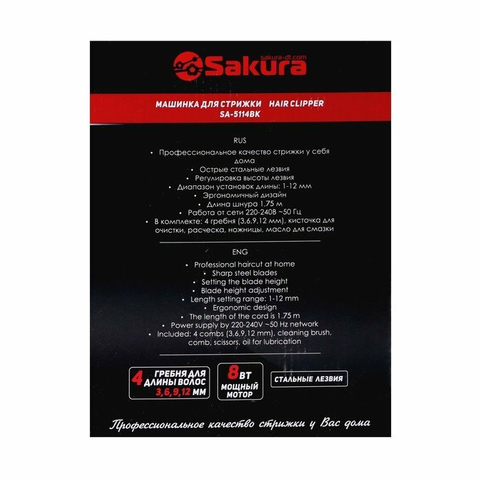 SAKURA Машинка для стрижки Sakura SA-5114BK, 8 Вт, 1-12 мм, 4 насадки, 220 В, чёрная