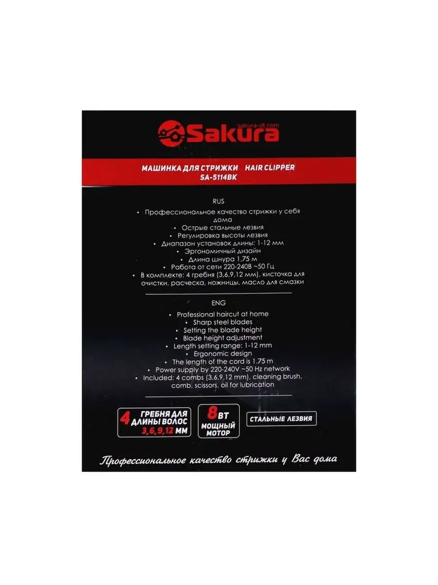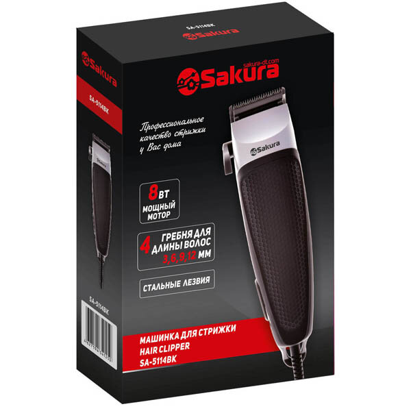 Машинка для стрижки SAKURA SA-5114BK 4 насадки, черный