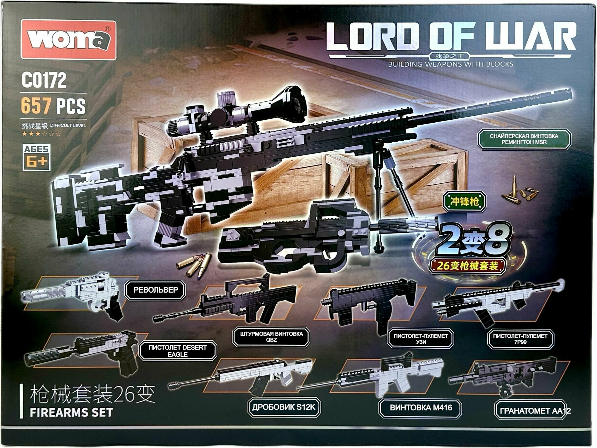 Купить Конструктор Оружие 2в8, военный конструктор, 657 деталей, винтовка, пистолет, пулемет, 48х36х9 см