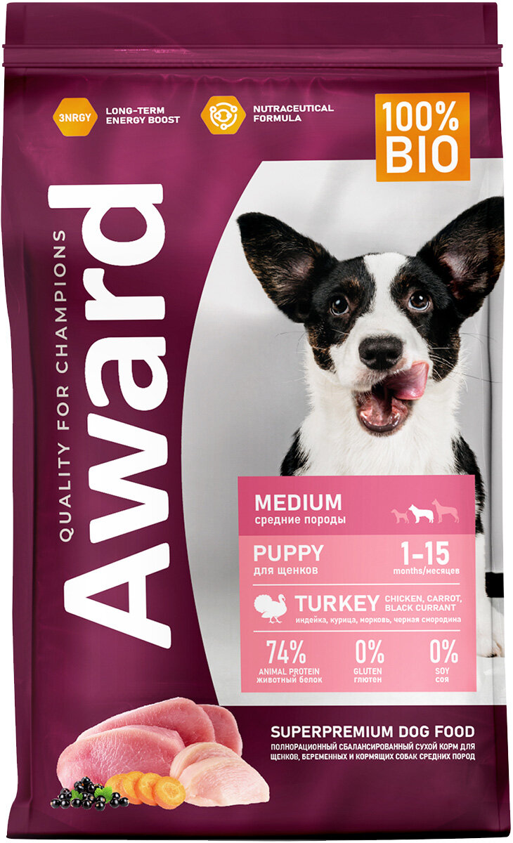Award - Сухой корм для щенков от 1 мес, беременных и кормящих сук средних пород с индейкой и курицей с добавлением моркови и черной смородины (2кг)
