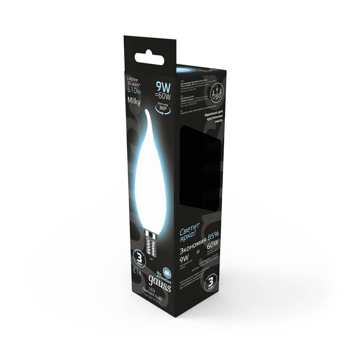 Упаковка ламп 10 штук Gauss Filament Свеча на ветру 9W 610lm 4100К Е14 milky LED 1/10/50