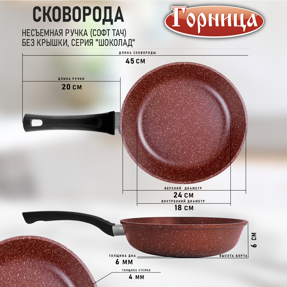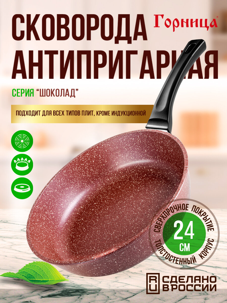 Сковорода 24 см, несъемная ручка (софт тач), без крышки, серия Шоколад Горница