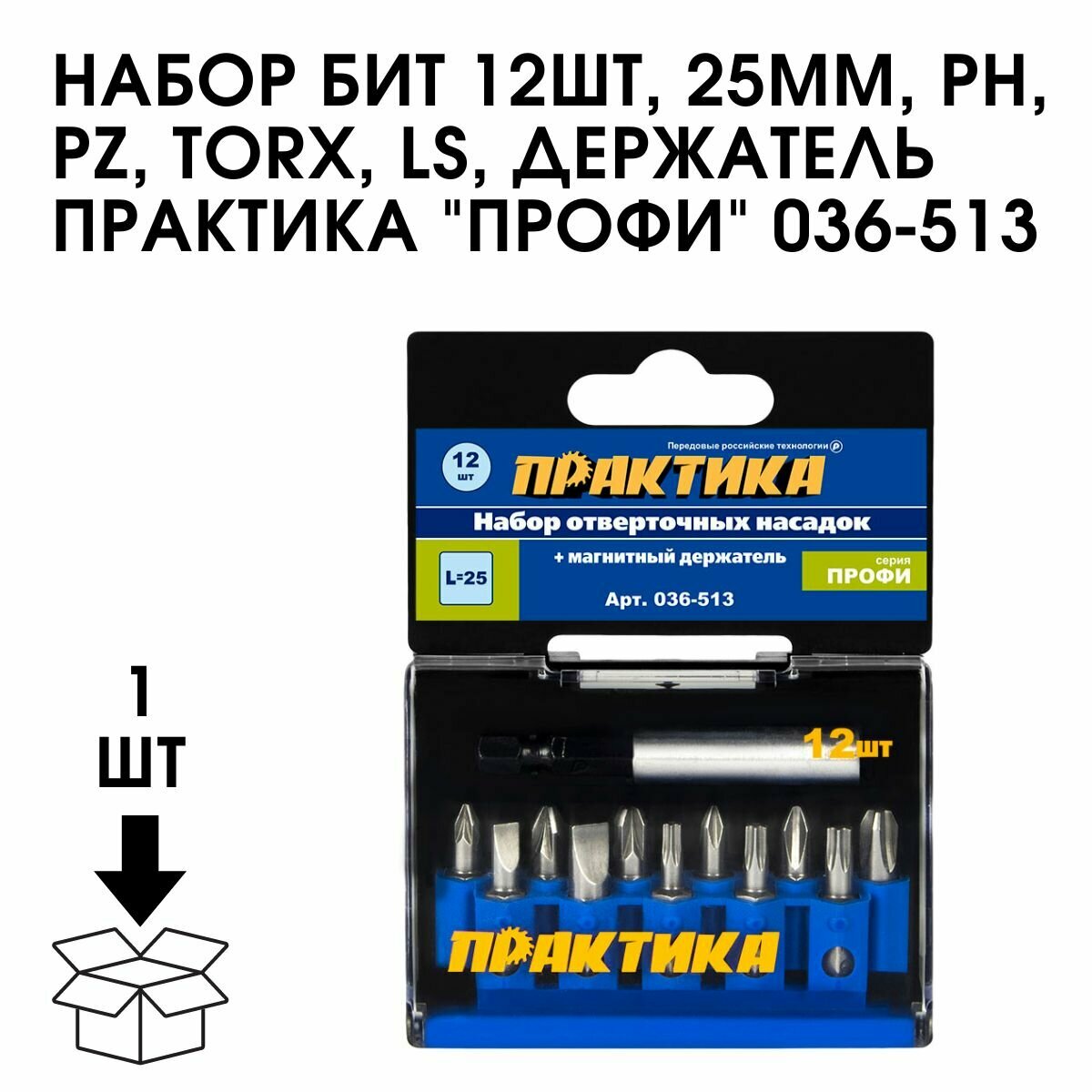 Набор бит ПРАКТИКА "Профи" 12шт PH 3шт PZ 3шт Torx 3шт LS 2шт x 25мм держатель, кассета ("Профи", 12шт, PH 3шт, PZ 3шт, Torx 3шт, LS 2шт, 25мм, держатель, кассета)