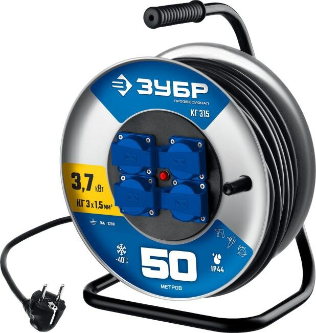 ЗУБР КГ 315, 50 м, 3700 Вт, 4 гнезда, IP44, КГ 3х1.5 мм² удлинитель на катушке (55080-50)