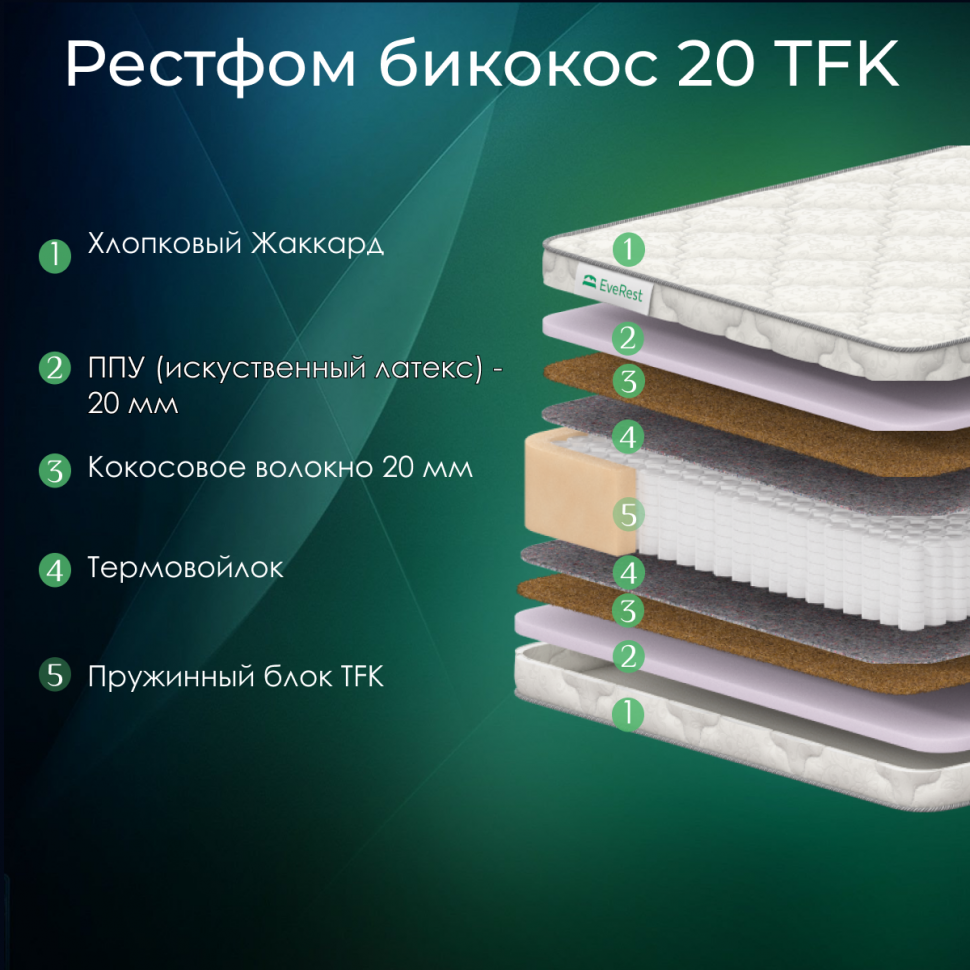 Матрас Everest Рестфом Бикокос 20 TFK - жесткость средняя, пружинный, независимый пружинный блок ТФК, с кокосом, чехол жаккард 155х180