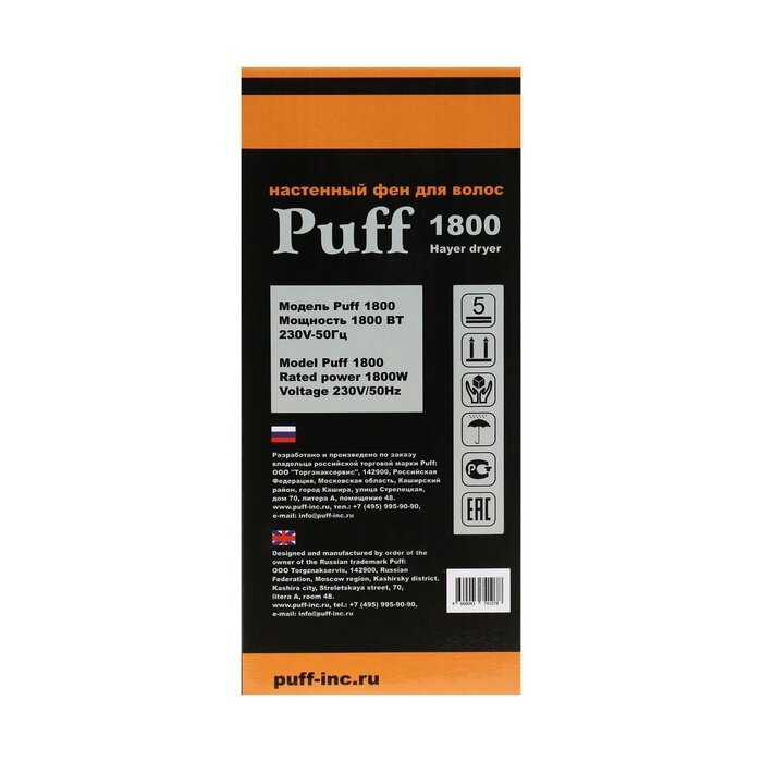 Фен для волос настенный "Puff-1800", снежнобелый, 1,8 кВт, 18х11х24,4 см